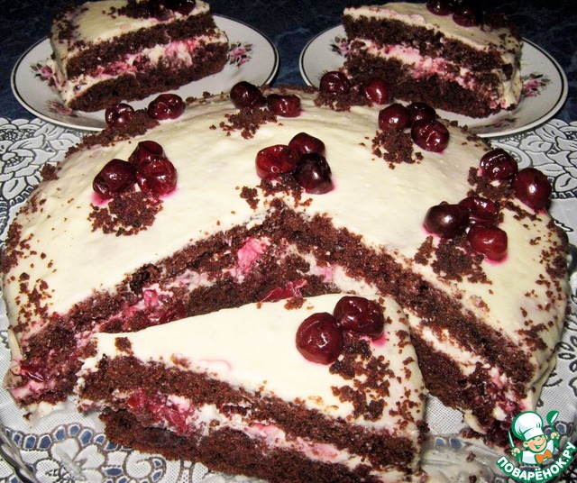 Торт великолепный! Очень вкусно, ароматно! Вишню я на сутки засыпала сахаром, влила ложку коньяка. Этим сиропом пропитала коржи. Бисквит разрезала на две части. В сметанный крем добавила творог, пробила блендером. Очень-очень вкусно!