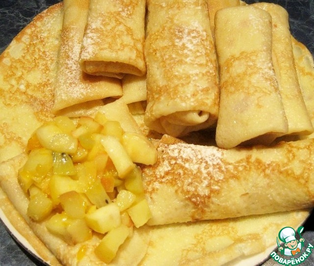 У меня начинка - киви, яблоко, мандарин. Карамелизовала фрукты, влила коньяк, подожгла. Очень вкусные блины с фруктовой начинкой "фламбе" получились!