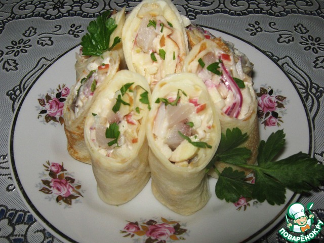 Блинчики - прелесть! Сочетание беспроигрышное! Селёдочка, с яблоком и лучком - это очень вкусно! Лук у меня красный, кожуру с яблока не снимала. Всей семье очень понравилось! А я рада, что нашла этот рецепт!