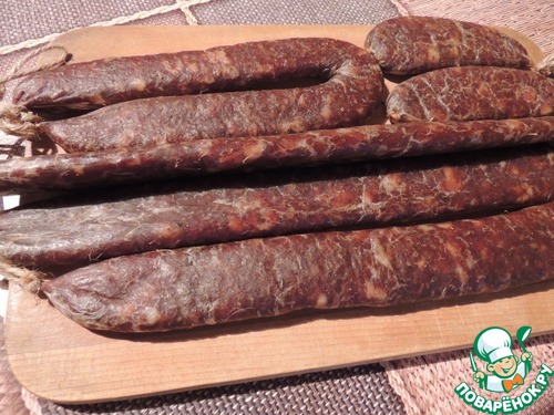 После набивки получилось четыре полноценные колбаски и 2 маленьких "огрызка", сделала так специально, дабы показать как это влияет на сроки вяления