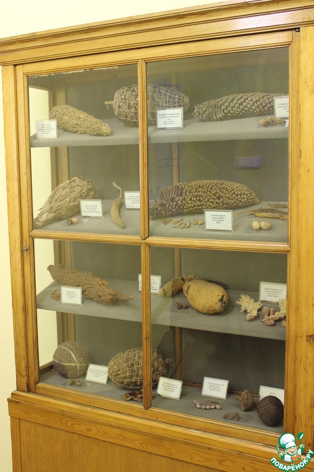 старинный шкаф с выложенными в нем шишками различных растений.Размер шишек - с