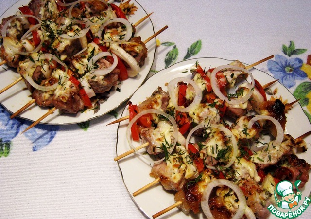 Замечательная идея приготовления шашлыка в духовке! Мариновала свинину в майонезе. Нанизывала на шпажки мясо, чередуя кусочки сала, лук и помидоры. Для румяности подержала шашлык под грилем. Очень вкусно! Мясо нежное и сочное, с волшебным ароматом! Посыпала зеленью и маринованным лучком. Семья в восторге!