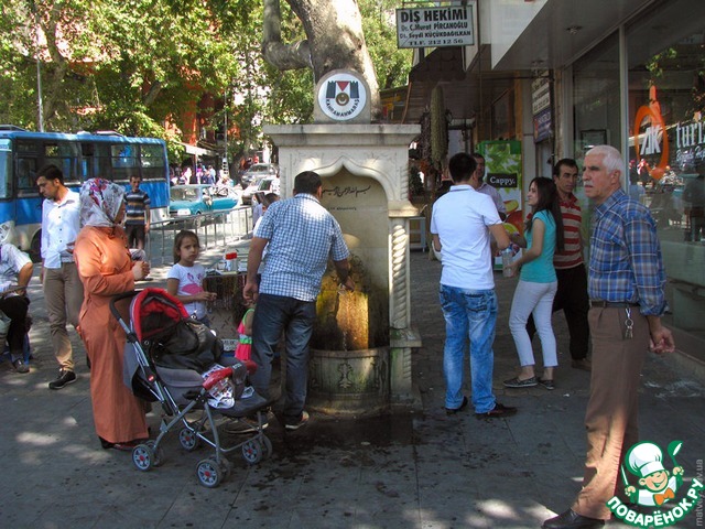 Люди у питьевого фонтанчика с водой в центре города. Кархаманмараш, Турция