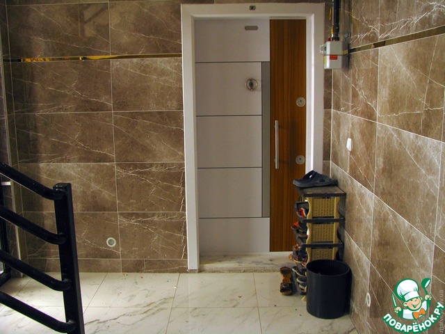 Внутри нового многоквартирного дома. Обувь снимается перед дверью в общем коридоре. Не воруют, потому что вообще ничего не воруют, и потому что подъезд на кодовом замке. Дверь, напоминающая композицию Мондриана — типовая, у всех такие.
