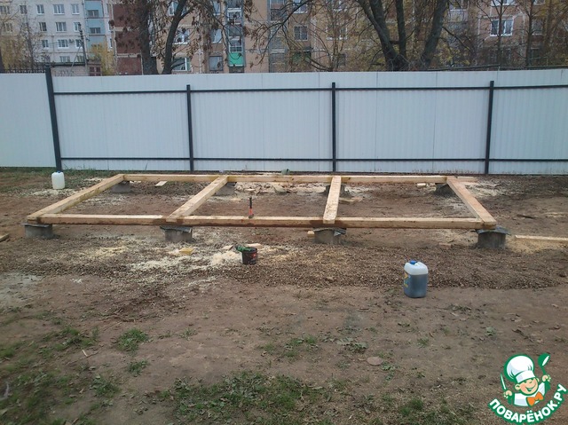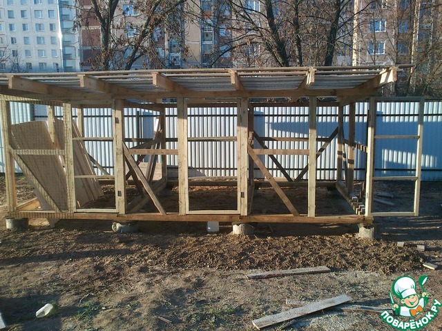 ставим сваи на глубину промерзания грунта. прокладываем технониколь и крепим брус-основу вольеров. размеры 3 на 7 метров. общая площадь 21 квадратный метр. как малогабаритная квартира, не правда ли?
