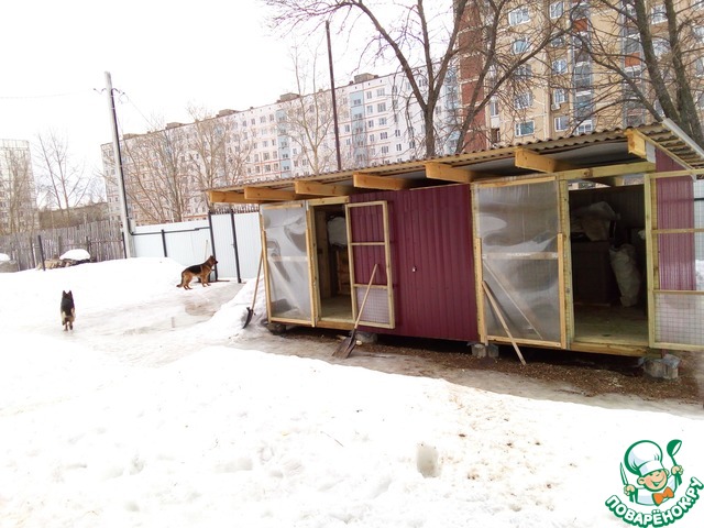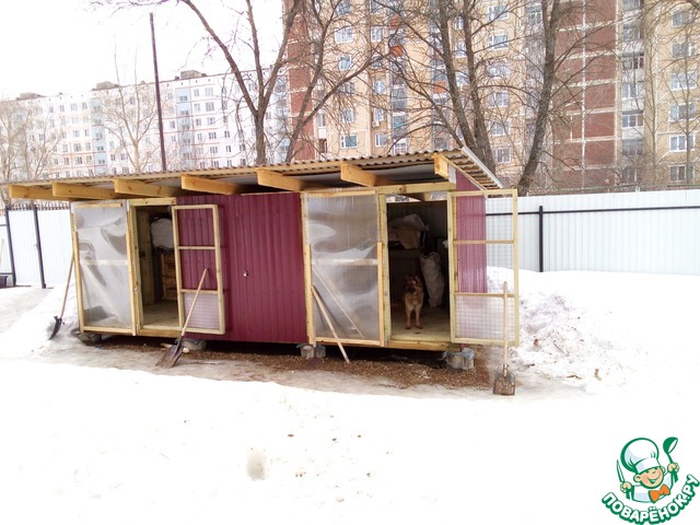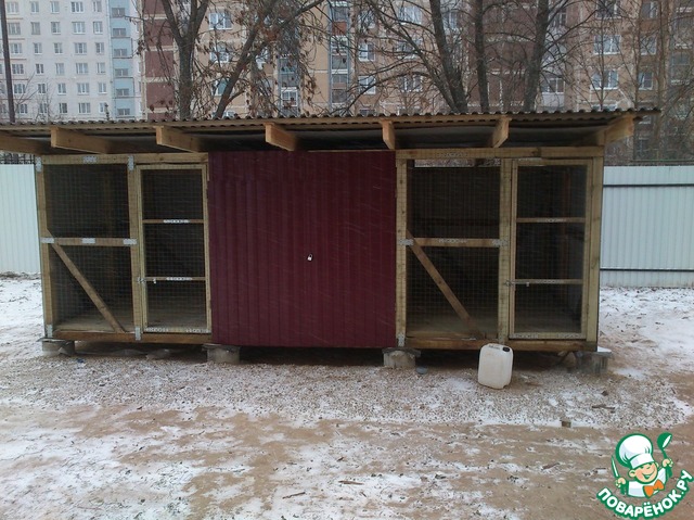 вышло два вольера 2на 3 метра и хозпомещение по середине - три на три метра. под охраной!!! перед вольерами подсыпаем гравий.