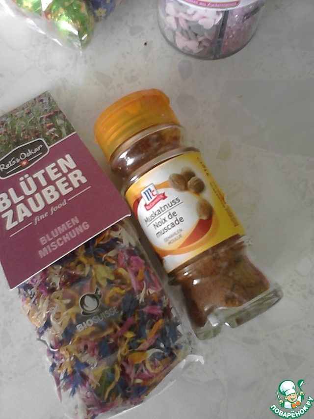 Мускатный орех. Лепестки цветов (как я поняла, календула, василек и ещё что-то), для украшения десертов, салатов и т. д.