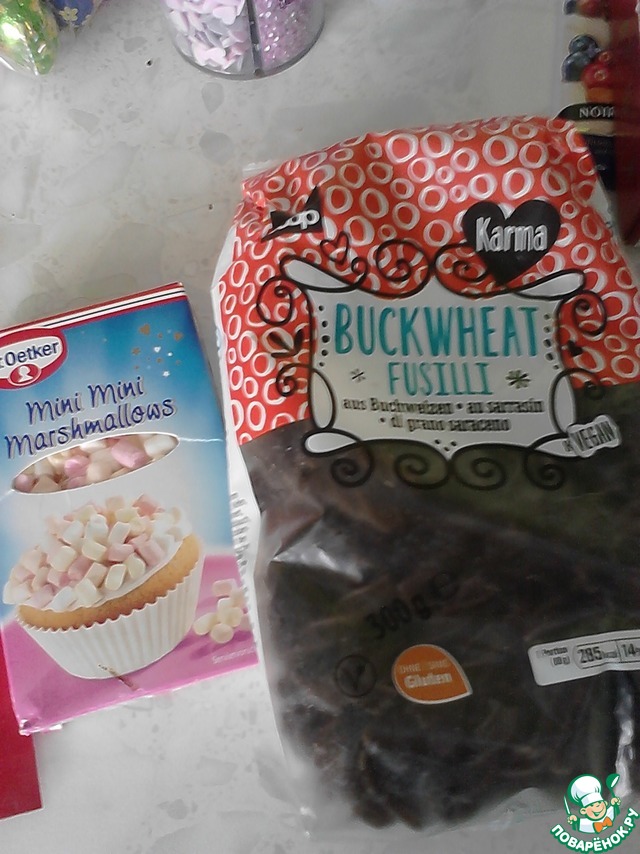 Шоколадная паста фузилли (никогда не пробовала и не знала, что существует в таком виде), мини-маршмеллоу.