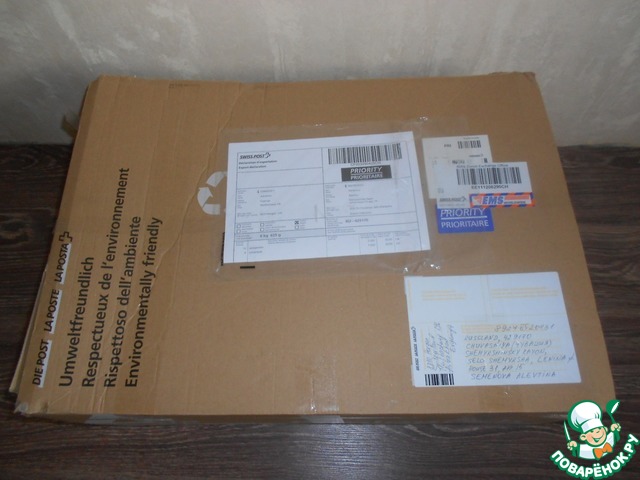 astrakhan81, милая девушка Евгения из далекой Швейцарии. Сегодня ближе к обеду мне позвонили из почты и сказали, что для меня есть международная посылка, они меня сразу предупредили, что посылка немного повреждена (сказали, видимо повреждения произошли при транспортировке). И любезно мне привезли посылку на работу. Посылка оказалась тяжеленная, целых 6 кг 625г. Коробка немного была повреждена, руку можно было засунуть в коробку и что-то нащупать. Т. к. у меня на работе есть весы, я проверила вес, он был даже слегка больше заявленной.
