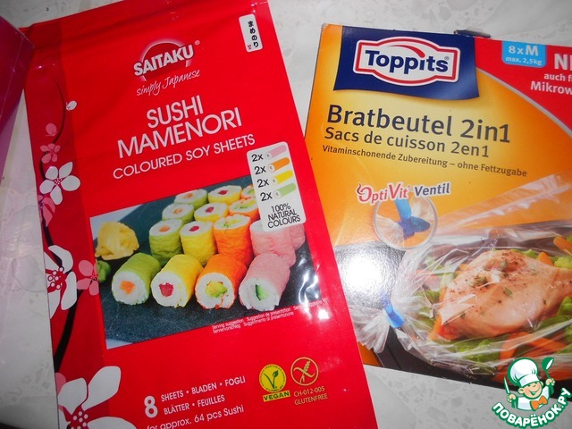 Листы для суши (может, неправильно выражаюсь), 8 шт, 2-розовые, 2-оранжевые,2 -желтые, 2 -зеленые). Пакет для запекания мяса и не только.