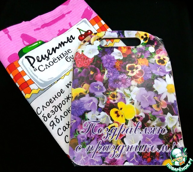 Яркое кухонное полотенце с рецептом и очень красивая разделочная доска