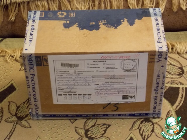 В субботу возвращаясь поздно домой я обнаружила в своем почтовом ящике извещение на посылку. Посмотрев на часы, я вздохнула, понимая, что время выдачи уже закончилось и вообще почта закрыта. Еле дождавшись понедельника я помчалась на почту. А там тьма народу, конечно же меня это не остановила и уже через час заветная посылочка была у меня в руках. Вот она.