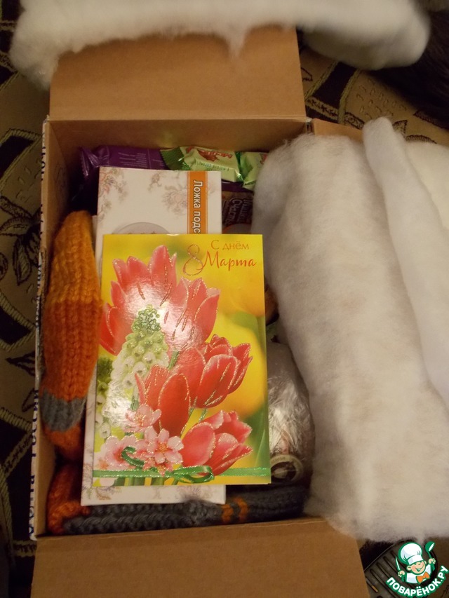 Как лиса у винограда я крутилась около нее чтобы открыть, пока не догадалась взять нож. Первое что я увидела это мягкий материал, чем то схожий с ватой, в который была упакована посылка. Открываем ее и видим открытку, которую я сразу прочитала. Я долго гадала кто же это, но с этой милой девочкой я практически не знакома. И я очень рада, что она стала моей Феей. Это Таня ( Hvostiktv).