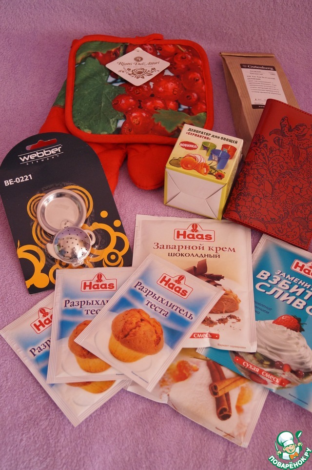 Здесь, чего только нет!!! Набор продукции Haas, красочная прихватка, декоратор для овощей, необыкновенная рыбка для заварки чая, шикарный чай, и просто суперская обложка на паспорт)))