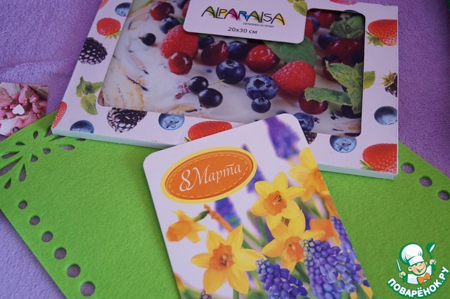 Очень красивая разделочная доска, по настоящему яркая и весенняя салфетка и поздравление в открытке! Я в восторге!