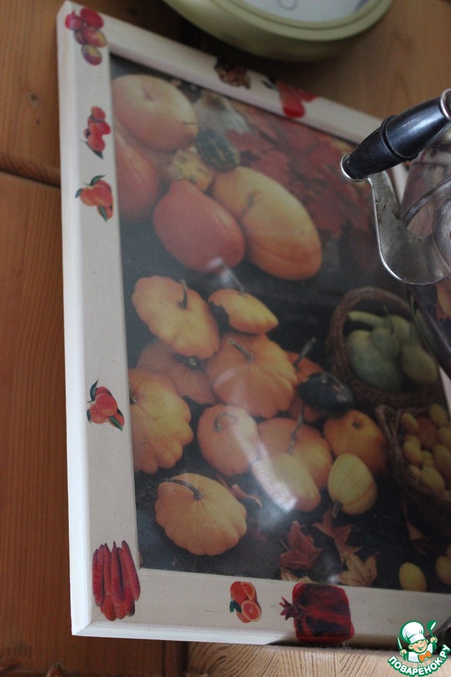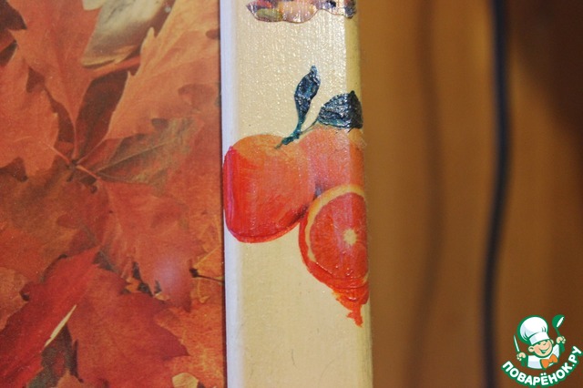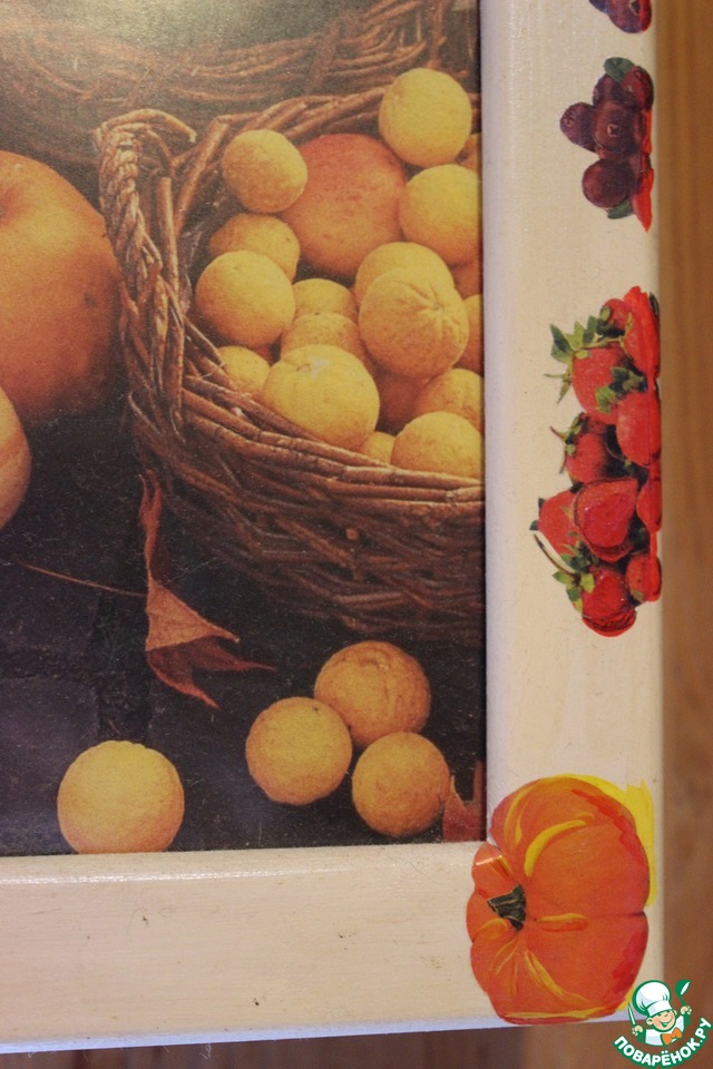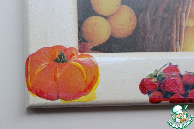 Это были не декупажные карты и не салфетки, а изображения фруктов на плотной бумаге, вырезанные из журналов. Рамка была окрашена акриловой краской, а затем изображения были наклеены и "усилены" цветными акриловыми красками...