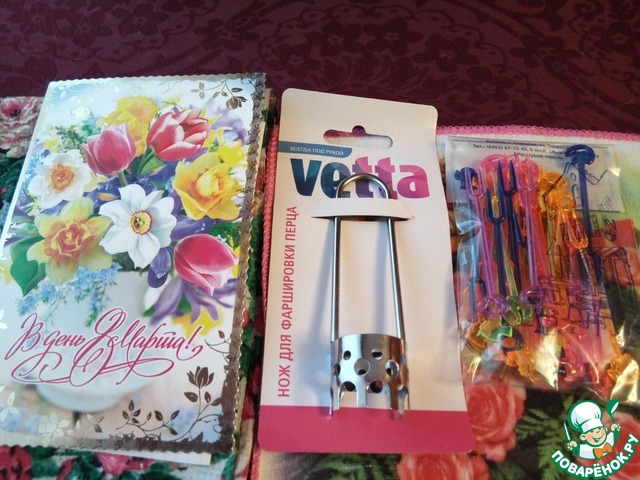 Когда была объявлена акция Поваренка о подарках к 8 марта, я не могла принять в ней участие, уровень не позволял, да и как то сомневалась в своих силах... Но видимо Бог знает все желания нашего сердца, и мне неожиданно поступило предложение от Иринки (владаши) написать ей свой адрес, чтоб она меня немножко поздравила с праздником! Конечно я с радостью согласилась и попросила тоже дать мне её адрес.