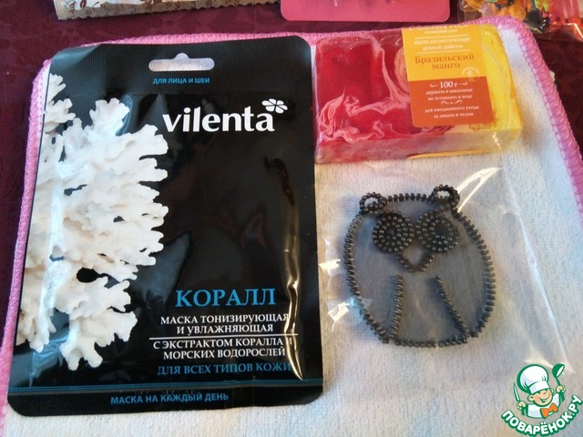 А вот для "женского сердца" маска для лица, брошь ручной работы самой Иринки "Сова" и мыло "Бразильское манго", если б только можно было передать аромат этого мыла! оно пахло на всю посылку! Сочный манго и не меньше, теперь благоухает в моей ванной комнате!