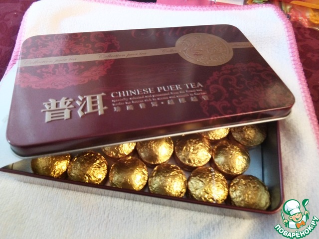 Вот такая жестяная коробочка, с таинственным драконом и цвета марсала, а внутри золотые штучки, это чай пуэр! я такого даже не пробовала! Красота? Аж дух захватило!