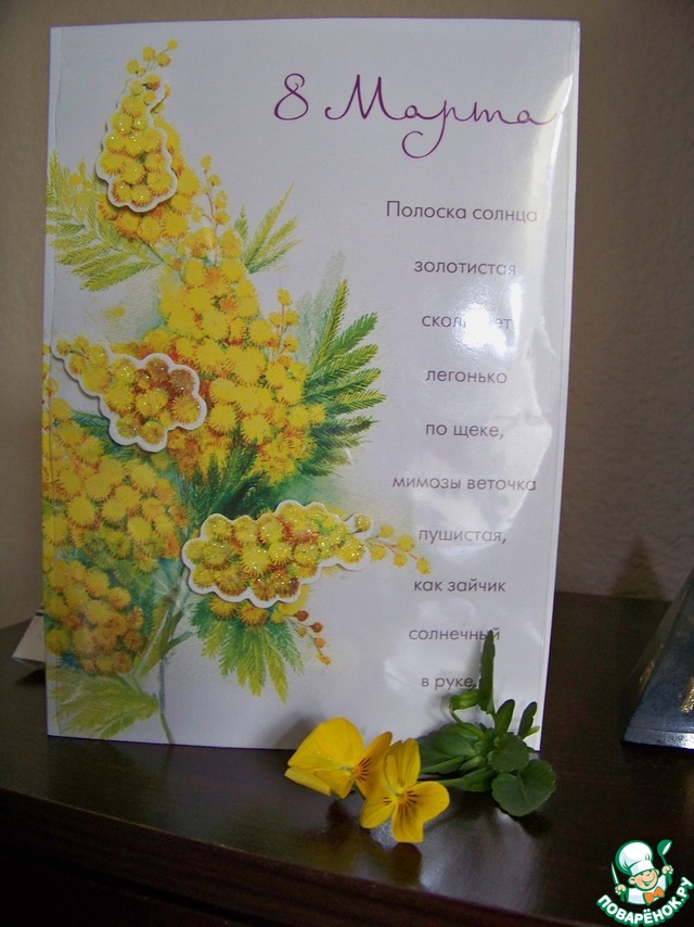 Полюбуйтесь, какая красивая открыточка! Мимоза, которая смотрится восхитительно,