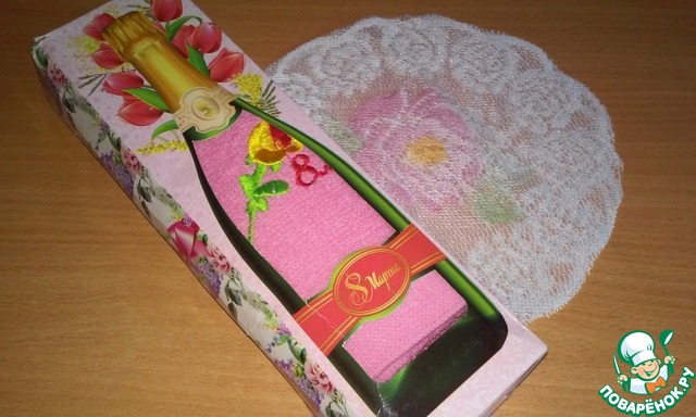 Посмотрите какие нежные салфеточки и полотенчик, так эффектно, по праздничному упакован в бутылочку Шампанского!