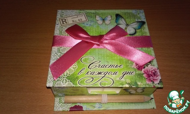 Вот такая нужная вещь. Это блок для записей, в изящной, очаровательной коробочке, да еще и с пожеланием счастья!