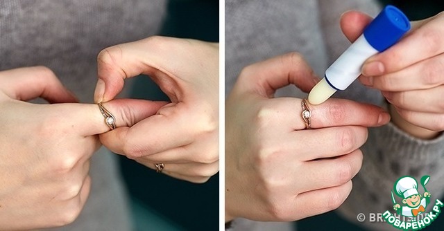 Бывает, что кольцо становится мало, а снять его уже не так просто, как надеть. Первое, что приходит в голову, — это мыло, но не спешите бежать в ванную, просто воспользуйтесь вашим бальзамом для губ. Смажьте кольцо со всех сторон, и снять его станет намного легче.