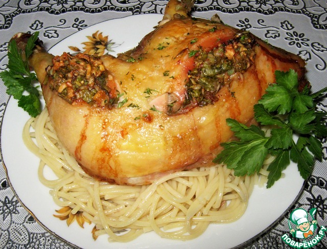 Рецепт шикарный! Никогда бы сама не догадалась так запечь окорочка)) В начинку добавила ещё семена горчицы. Остальное всё по рецепту. На гарнир отварила спагетти. Вкуснотища невероятная!!! Вынимала начинку, смешивая с курочкой и спагетти... Мужу и сыну тоже так посоветовала сделать)) Мы все были в восторге! Волшебный вкус и аромат! Очень-очень вкусно!!! Всем советую попробовать!