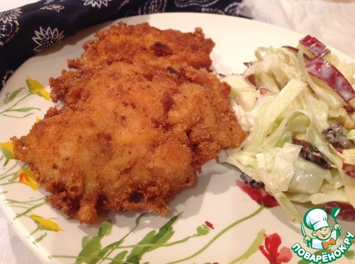 Никогда не ела вкуснее грудку!!! Вот уж на удивление грудка получилась сочная, присочная, а про корочку я смолчу!!! Безумно вкусно!!! Делала с твердым сыром, расплавился. Еще один рецепт любимчик в мою копилочку!!! Отлично к наггетсам, подошел Женечкин салатик!!!