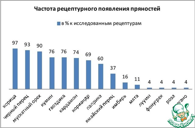 И уж совсем редко, пренебрежимо, всего по одному разу в рецептурах оказались шафран, фенхель, горчица, бадьян, куркума, чабер и лавр.