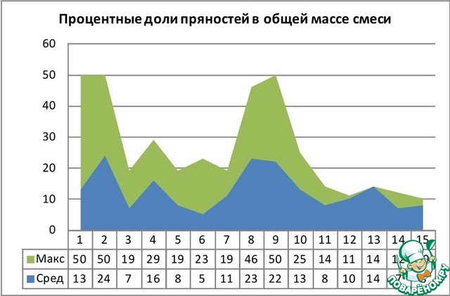 Полную долевую картину можно видеть на нижеследующей диаграмме, где синий цвет соответствует среднедолевым значениям пряностей, а зеленый - максимальным.