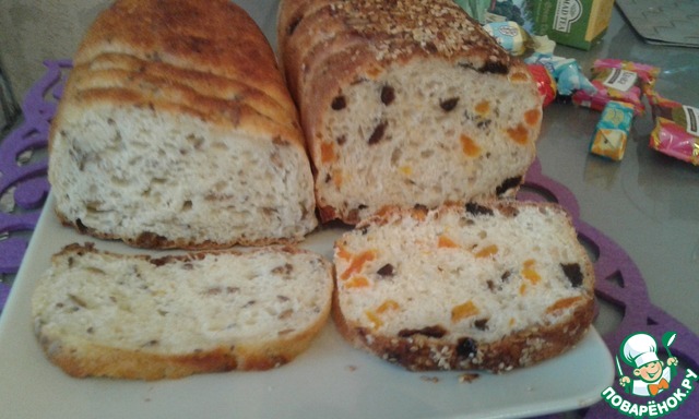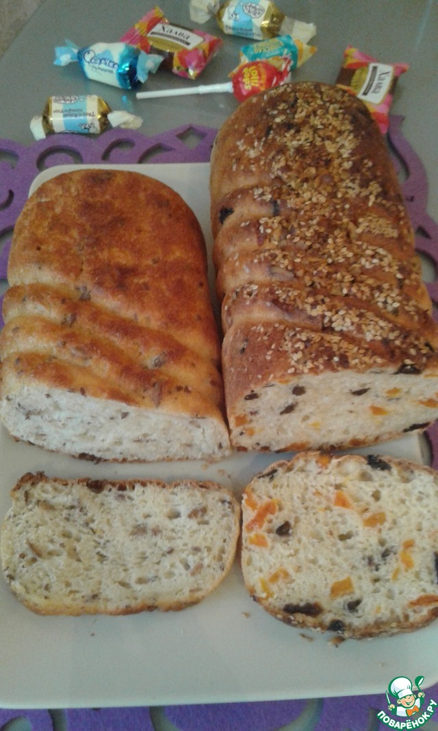 https://www.povarenok.ru/recipes/show/129489/, а вот тут милые поварятки, я повторюсь, так как хлебушек этот был уже в фотоотчете. Рецепт твердо и навечно вошёл в нашу семью, в этот раз пекла уже два хлебушка, один по рецепту Аллочки с семечками и семенами льна, а второй с курагой и черносливом, добавляла по горсти резаных сухофруктов. Сверху измельченный грецкий орех и кунжут. И ещё, не ставлю на ночь, замесила тесто, поставила в духовой шкаф на 30 мин при температуре 60 градусов, через это время, переключаю на 220 и вуаля!