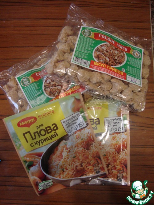 А ещё она мне по моей просьбе высылала рецепт плова с соевым мясом, так я несколько раз жаловалась ей, что никак мне могу нати соевого мяса. Специально поисками не занималась, но где была, везде спрашивала и искала! Так вот..
