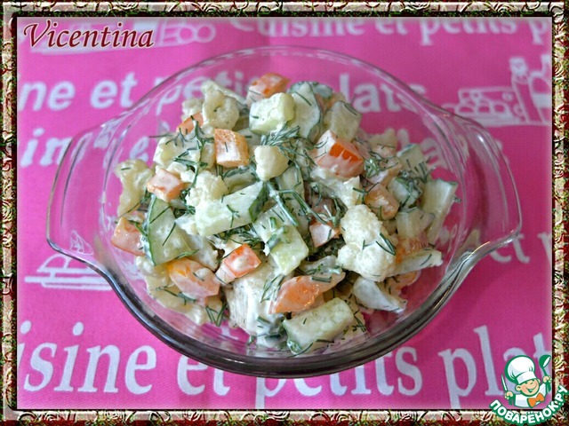 Приготовила со свежими огурцами. Цветную капусту варила совсем недолго, минуты 4, заправляла сметаной. Получилось очень вкусно, свежо, легко!