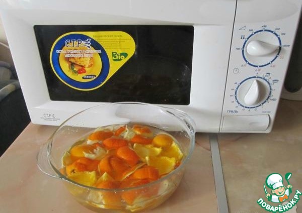 1) Берем емкость, подходящую для использования в микроволновке, и складываем в нее апельсиновую кожуру.