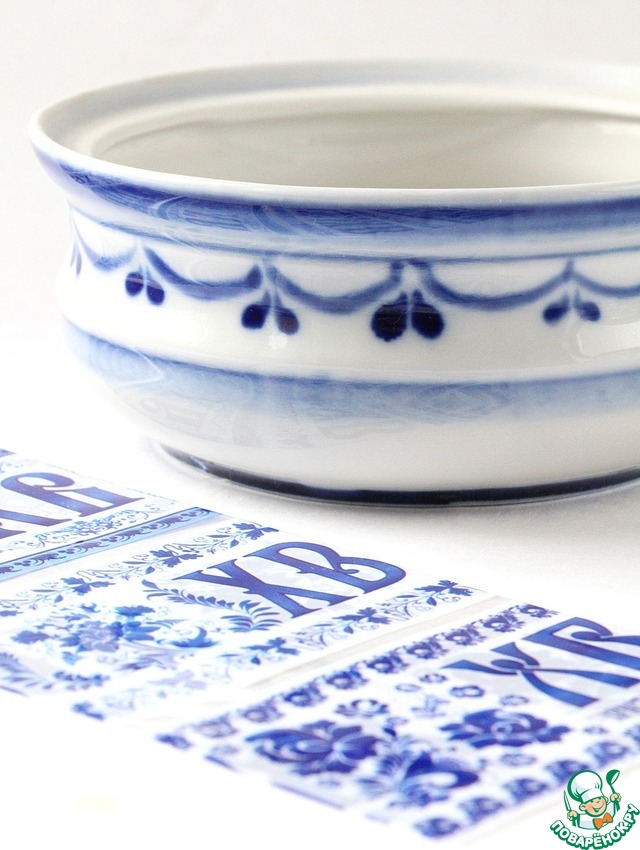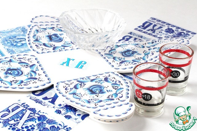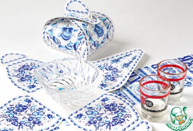 картинки для украшения пасхальных яиц, подарочные коробки, все подобрано в едином стиле росписи Гжель. На этом фото вы видите еще малюсенькую салатницу и две чудесные мини рюмочки.