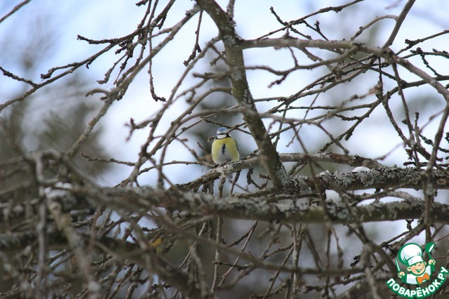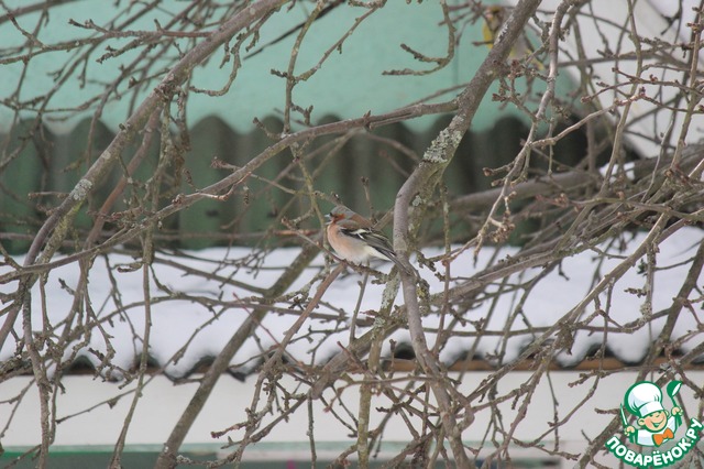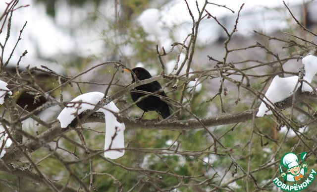 В саду много снега и птиц - черных дроздов, синиц, снегирей, зябликов, трясогузок...