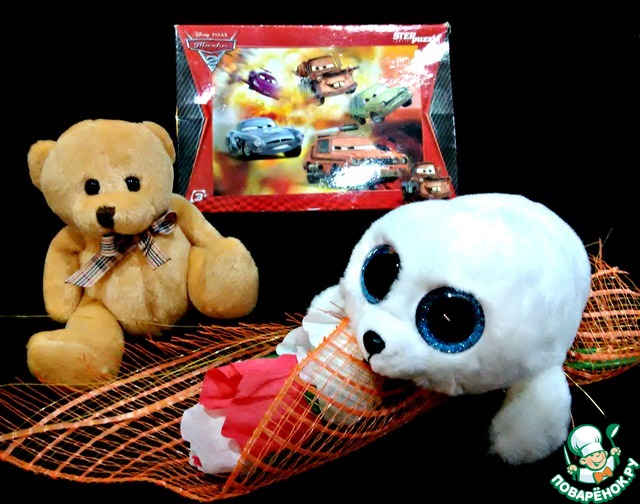 И две мягкие игрушки, мишка и белое чудо с такими бездонными глазками