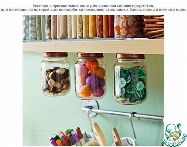Вот так можно подвесить в рукодельном шкафу баночки с мелочами или на кухне - баночки со специями.