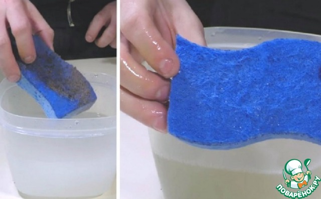 4. Чтобы очистить губку от жира и грязи, помести ее на ночь в раствор из 1 стакана воды и 2 столовых ложек соли. Также этот трюк можно применить для тряпочек из микрофибры.