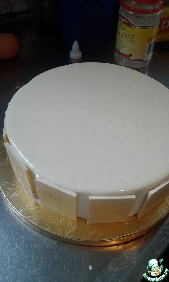 Торт я собирала таким образом -слой шантильи выдавила на пленку, в кольцо, используя кондитерский мешок с прямой насадкой 1.1. Так же обмазала и бока (ацетатная пленка обязательна). Вложила замороженный водный гель. А на него выложила все остальные слои, которые у меня были собраны и заморожены. Все дыры между внутренним вложением и шантильи замазала шантильи, выдавленным из мешка без насадки. Заморозила опять, а утром залила глазурью.