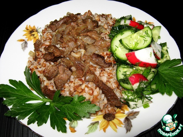 Гречка с мясом это очень вкусно! Мясо я нарезала тонкими ломтиками, оно отлично приготовилось, мягкое и нежное. Подала с овощным салатом. Замечательно пообедали.