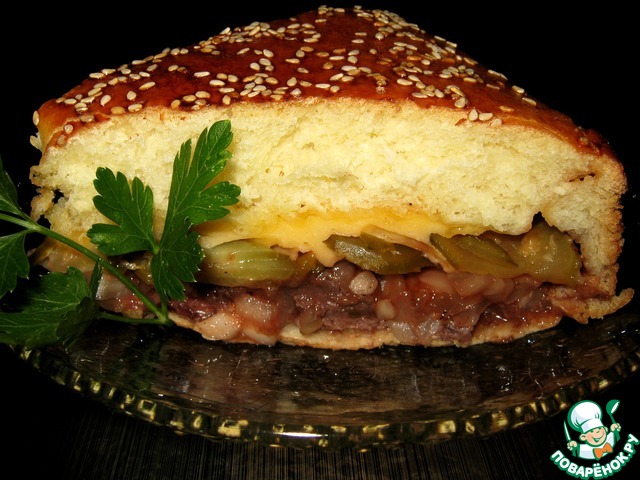 Прекрасный пирог! Готовить несложно и быстро. Такая замечательная идея! Фарш я заменила на рубленое мясо, нам так больше нравится. Добавляла кетчуп. Очень вкусный пирог получился! И в разрезе...