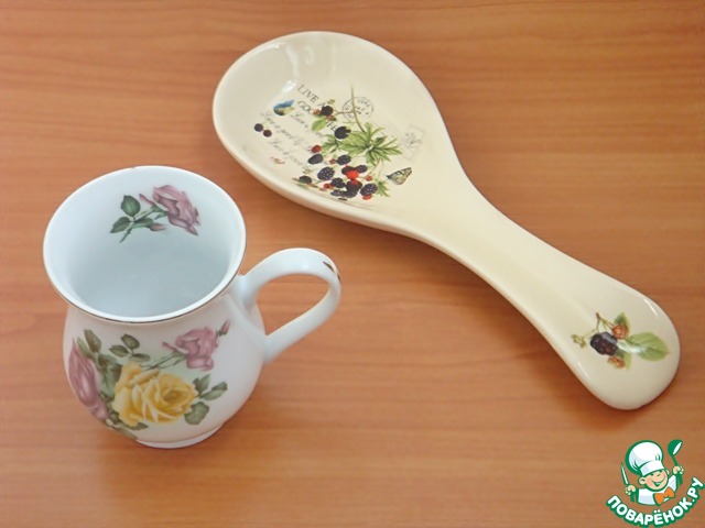 Красивой формы кружка с чудесными розами. Подставка под ложку не только удобная, но и замечательно вписывается в интерьер кухни.