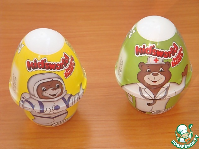 Очень вкусный и нежный двухцветный десерт-пудинг "карамель-шоколад"с сюрпризом-игрушкой. Верхняя пленочка легко снимается, внутри находится пластиковое яйцо, которое разделяется на две части. В одной части находится игрушка, в другой - молочный десерт.