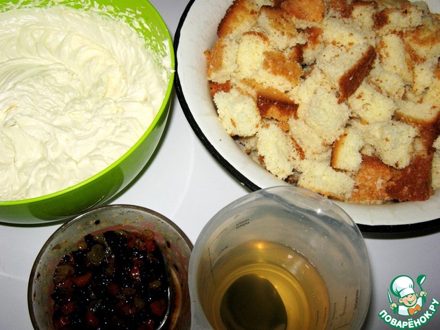 Испекла я бисквит, нарезала. Приготовила сироп. Подготовила сухофрукты и крем "Пломбир".