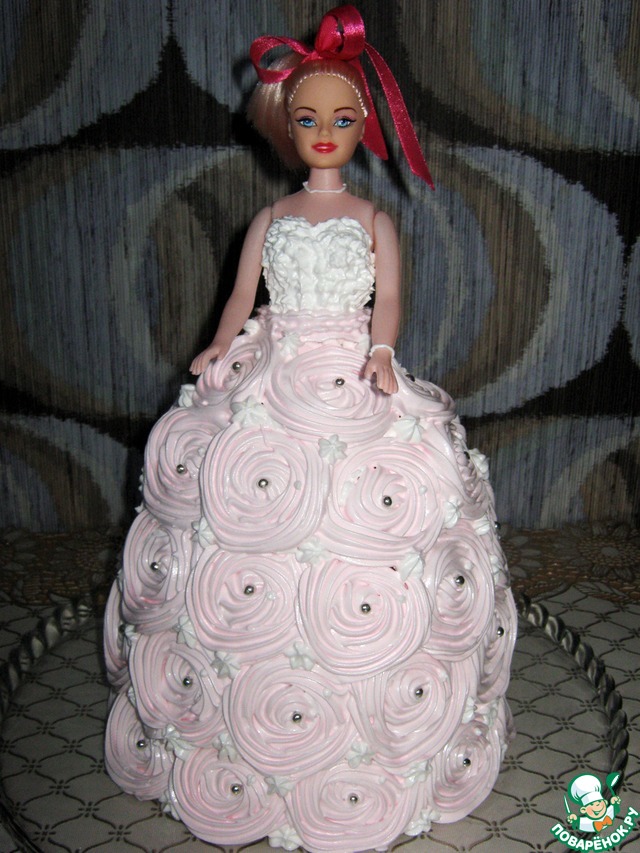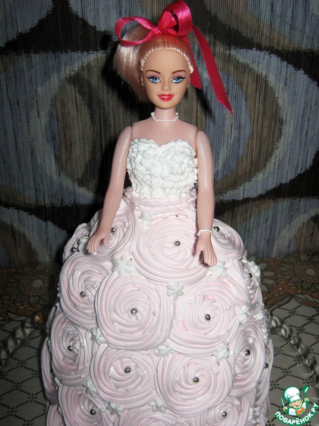Приготовила крем "Мокрое безе". Платье готово. Теперь бусы... браслет, из того же крема. Повязала ленту в прическу. И вот такая Барби у меня получилась.