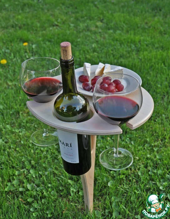 Компактный столик с отверстиями для бокалов и бутылок, который легко можно воткнуть в землю или в песок.