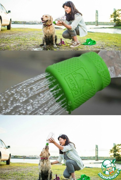 Яркая насадка-рассеиватель, которая легко накручивается на любую пластиковую бутылку, превращая ее в портативный душ для собак.