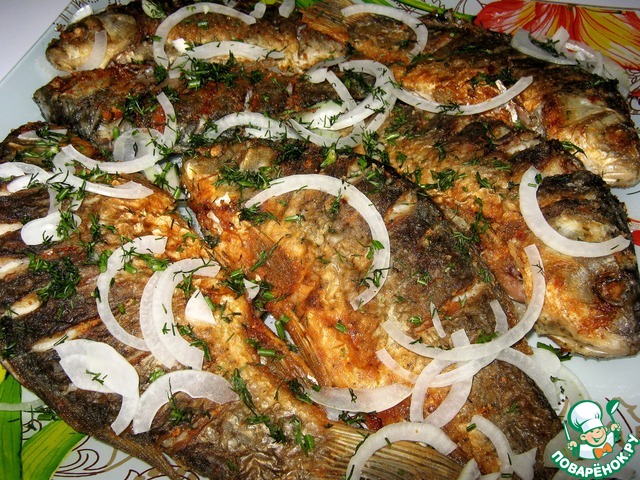 Замечательные караси! Хороша рыбка - хрустящая поджаренная корочка и сочное нежное мясо! Вкуснятина! От себя рыбку посыпала репчатым луком и измельчённым укропом, мы так любим.